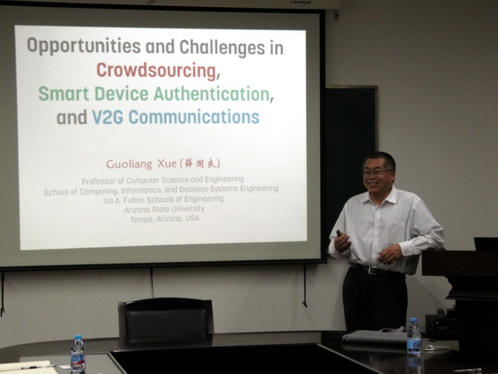 2017年5月17日上午,应公司邀请,美国亚利桑那州立大学教授、IEEE Fellow 薛国良博士来公司作了题为“众包、智能设备认证和车辆网格通信的机遇与挑战”的学术报告,并与公司师生在济事楼417会议室进行了深入的学术交流及研讨。软件公司穆斌教授、饶卫雄教授、尹长青教授等参加了报告会。本次报告会也是软件公司图灵讲坛第一期。