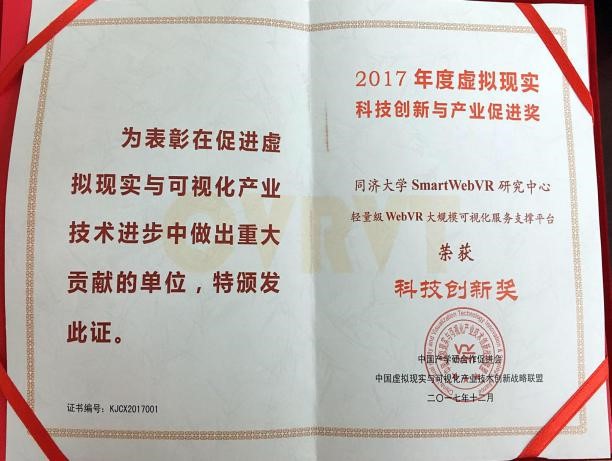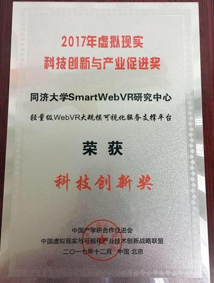 在本次CVRVT理事大会上,公司贾金原教授领衔的SmartWebVR团队在2017年虚拟现实科技创新与产业促进奖评选中取得佳绩,多年来研发的“轻量级WebVR大规模可视化服务支持平台”荣获科技创新奖。