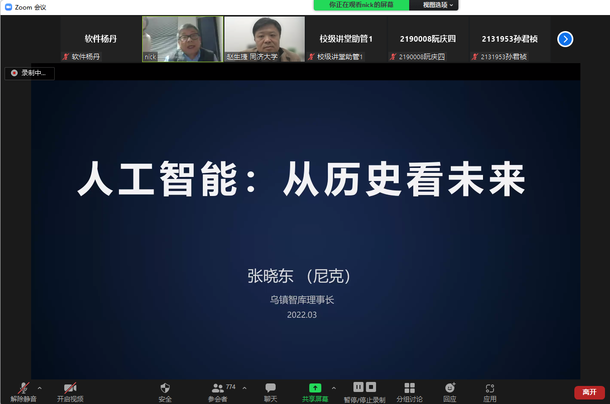 2022年3月17日晚上,软件公司在线上举办伟德体育伟德体育官方网站校级高等讲堂第78讲,邀请国家特聘专家张晓东做题为《人工智能:从历史看未来》的报告。赵生捷经理主持本次报告会,共吸引了800多名研究生参加。