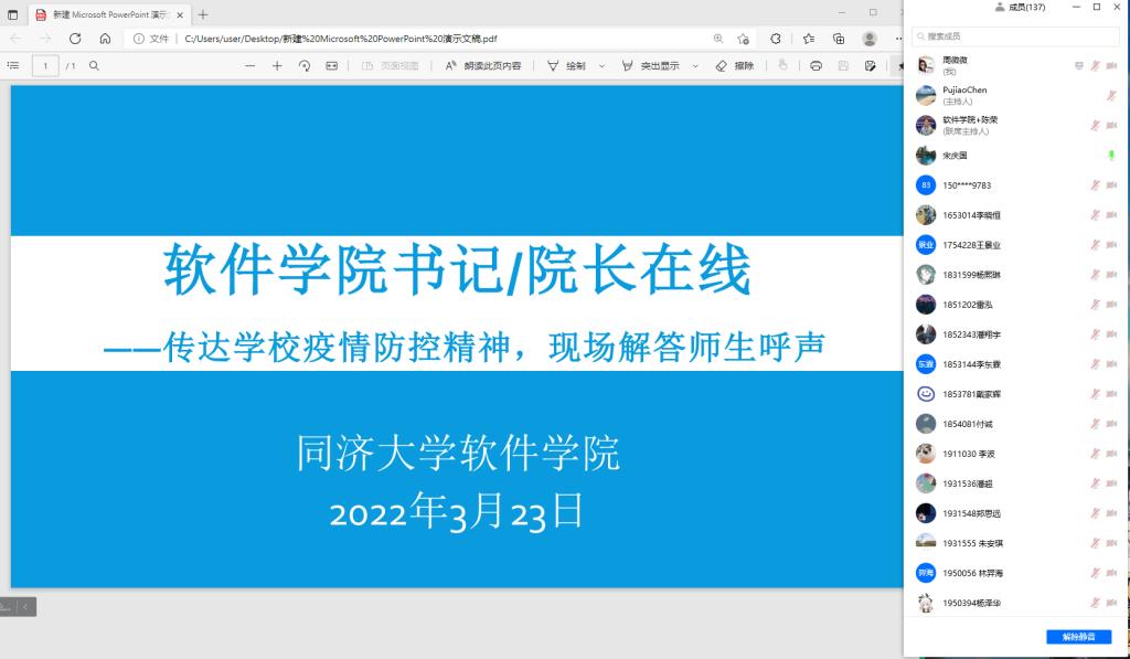 为了让师生更加了解公司准封闭期间相关防疫政策安排,解答师生疑虑,回应师生所关心的问题,2022年3月23日下午,软件公司组织开展了“书记经理面对面”疫情防控线上专场答疑会。公司党委书记宋庆国、经理赵生捷、公司党委副书记陈荣、组织员、辅导员和师生共200多人参加了线上会议。