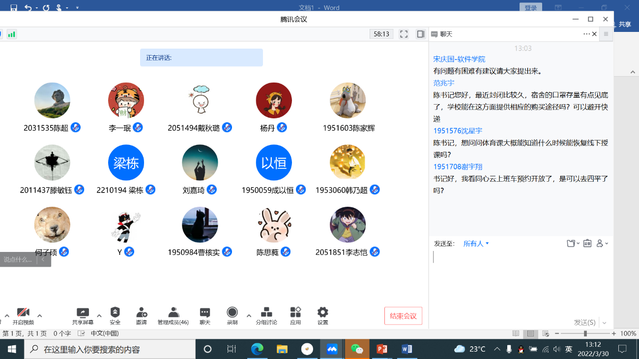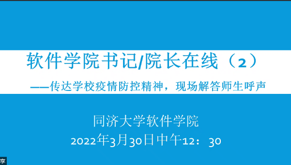 2022年3月20日中午,软件公司“书记经理师生面对面”疫情防控第二期线上活动如期举行。公司党委书记宋庆国、经理赵生捷、党委副书记兼纪委书记陈荣,通过云端跟公司师生见面交流,传达最新疫情防控政策和要求,解答师生关心关切的问题。