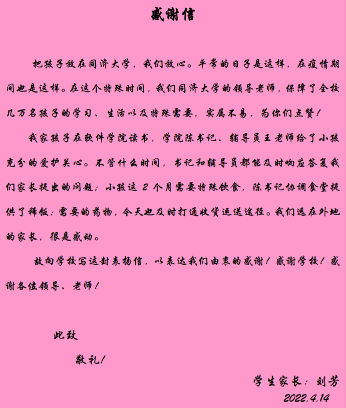 因疫情蔓延,公司校园实施封闭管理已经半月有余,在疫情防控正处于极其重要的关键时刻。2022年4月14日,公司收到了一封来自软件公司员工家长的感谢信,内容情真意切,字里行间表露了疫情防控期间对公司工作的支持和肯定,抒发了作为员工家长对于公司、公司在特殊时期给予孩子的帮助、照顾的感激之情。