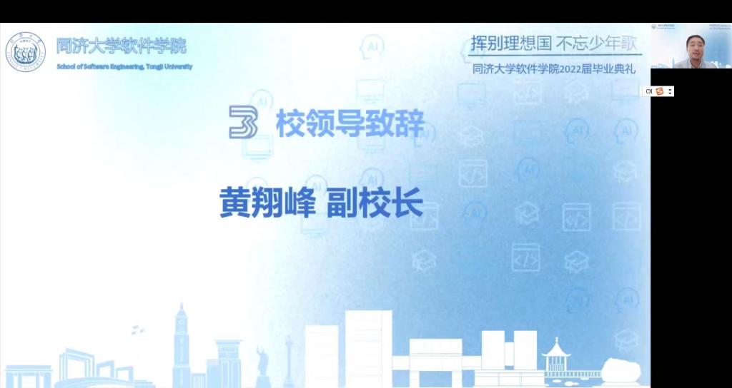 本科毕业生代表张艺腾,从自己四年的成长经历讲述对同学、公司的不舍和对未来的期待,并承诺,“毕业不是学习生涯的终点,我们仍会在日新月异的技术潮流中持续学习并提高自己的技术水平。”硕士毕业生代表严熊白雪回顾了自己的同济生涯,分享了关于个人 、集体和未来的想法,“对于软件学子而言,‘封闭’了脚步,却不能‘封闭’心灵。我们软件学子依旧用代码书写独属于我们的世界”,呼吁大家以个人之力量崛起,带动学科之进步。博士毕业生代表谭靖儒讲述自己博士生涯的收获和体会,“我们即将毕业,我们可以去思考自己真正想做的事情是什么,但因为只能由自己决定,不会再有老师督促、保护你,不管好坏,都需要对自己负责。”这就是毕业的迅速成长。