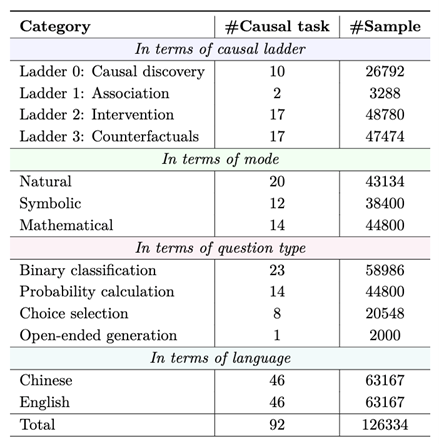 为了使因果推理能力评估有“考题”可循,联合团队构建了一套全新的评测数据集。基于四个层级的因果任务设置,涵盖了丰富的因果概念,包含超过12万条中英文数据。同时,研究人员还细致地将文本模态划分为日常表达(Natural)、抽象表达(Symbolic)和数学表达(Mathematical)三种子态,以考察模型在不同类型模态下的理解能力。该数据集90%的内容为全新构建,10%来自于现有公开数据集,既能与已有公开结果进行对比,反映评估的有效性,又能避免训练集数据污染问题。